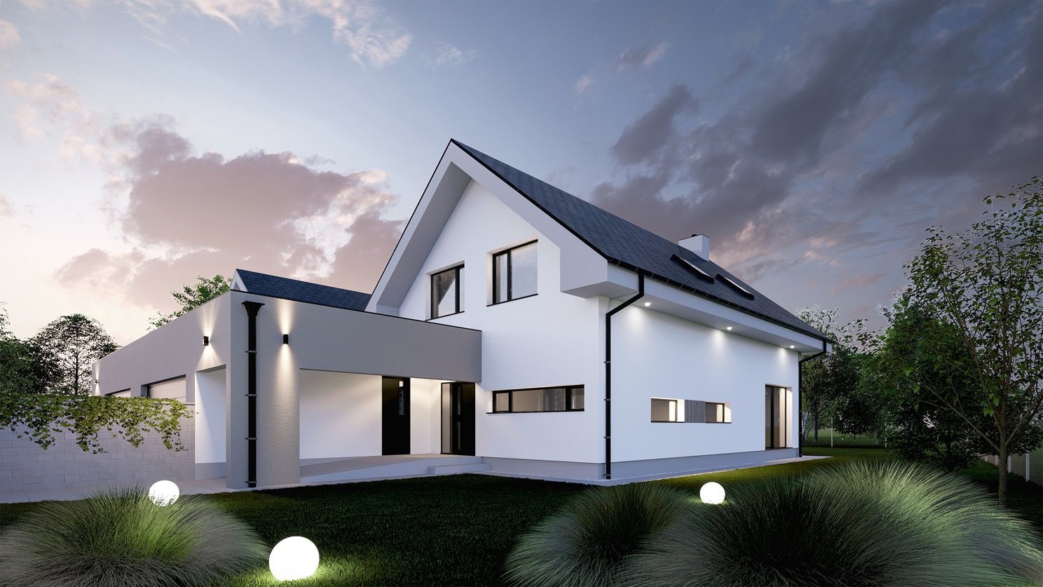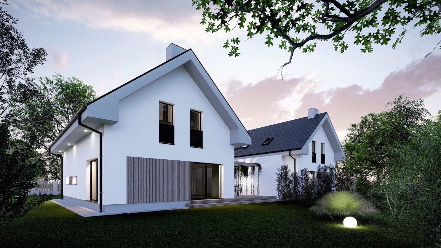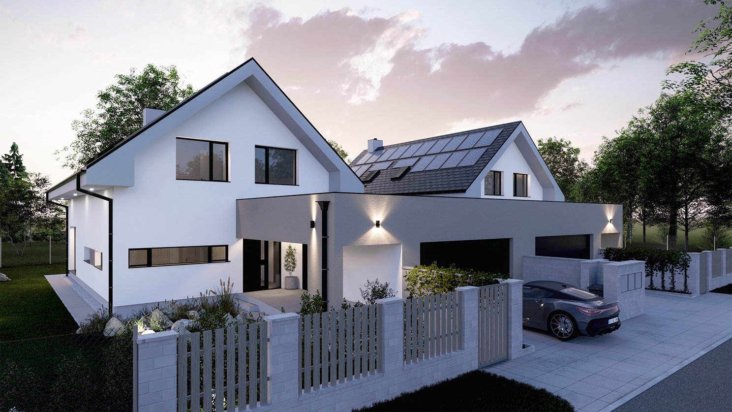 Moderní patrový dům VEXTA 167 nabízí velkorysé bydlení bez kompromisů pro velkou rodinu. Dřevostavba se sedlovou střechou má krytý vstup do domu a její součástí je garáž pro 2 auta, která je s domem propojena přes technickou místnost.