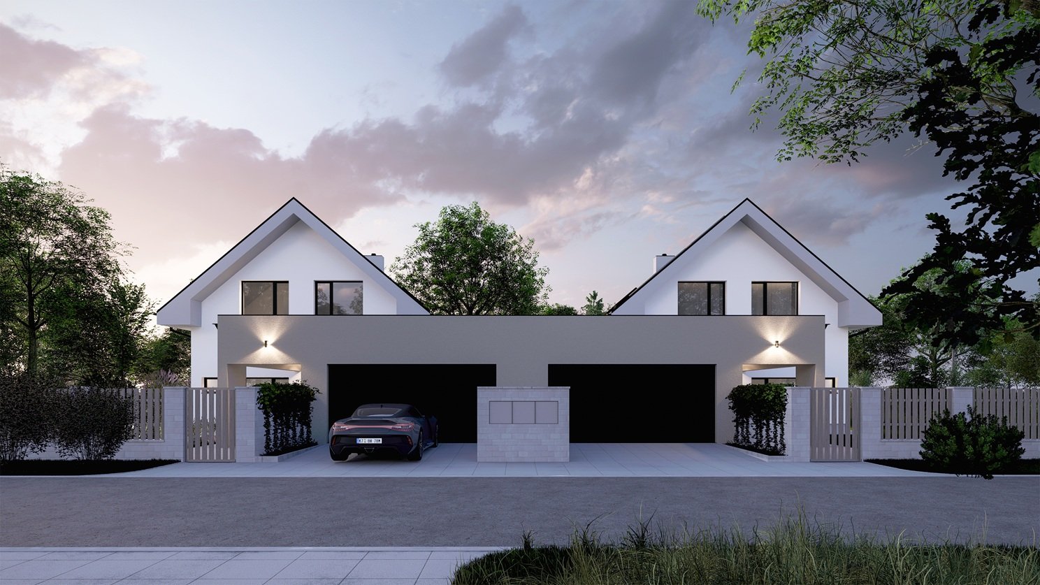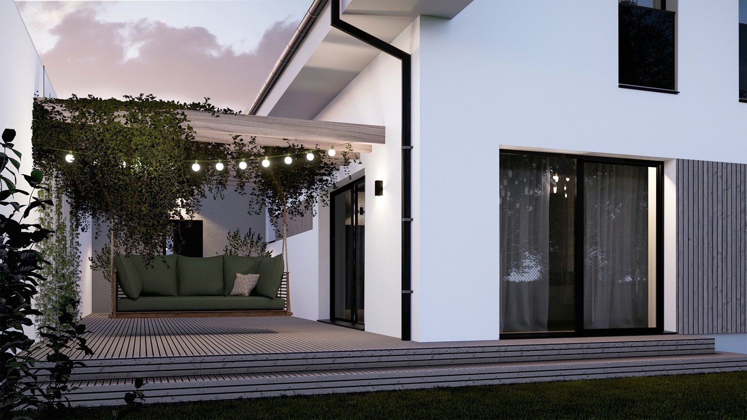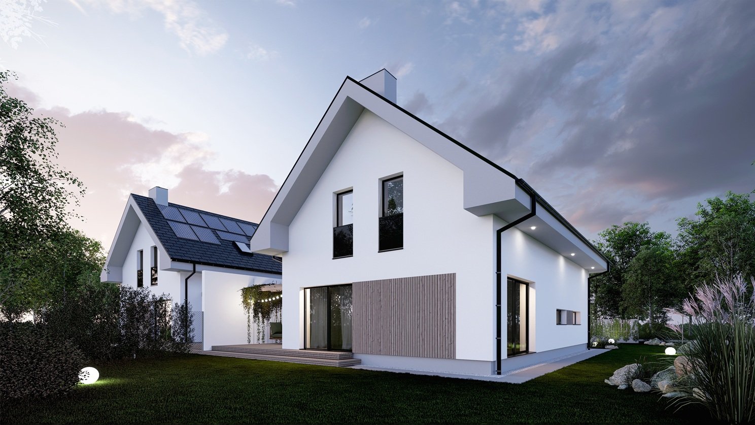 Moderní patrový dům VEXTA 167 nabízí velkorysé bydlení bez kompromisů pro velkou rodinu. Dřevostavba se sedlovou střechou má krytý vstup do domu a její součástí je garáž pro 2 auta, která je s domem propojena přes technickou místnost.